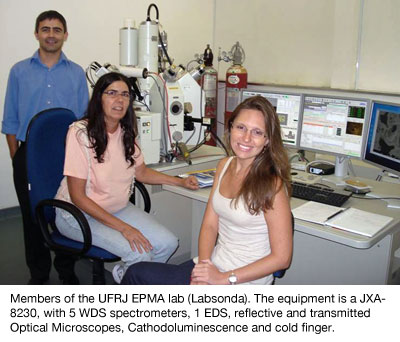 The Labsonda (The UFRJ EPMA lab) was created in 2010 and is coordinated by Dr. Isabel P. Ludka. Dr. Ludka is a former UFRJ student who also has a Doctor of Science (DSc) from the UFRJ/Maximillian Universität München, Germany. Her broad research investigation includes: Petrology and mineralogy, (genesis of granite and pegmatites, igneous and metamorphic rocks). She is also dedicated to a number of other projects since the Labsonda also has a multiuser facility mission.