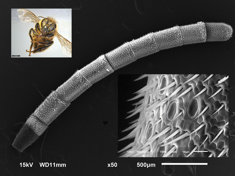 In the picture below, the antenna surface is magnified further to 3500X below showing the satellite disc like structures and sensory hairs. These features give bees the ability to sense the Earth’s magnetic fields, enabling them to travel further distances and detect flower scents at a closer range. Bees already play a significant part in our ecosystem and benefit a plethora of species including humans. With their incredible anatomy, the bee could go as far as inspiring a new type of electromagnetic field navigation system based on their antennae.