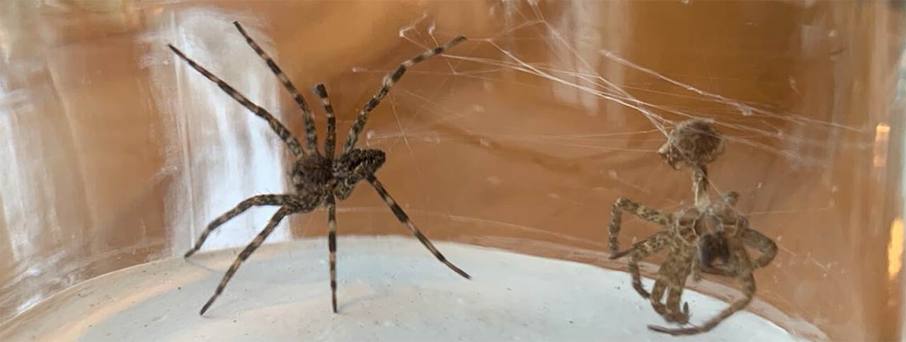 “Charlie” shown with molt complete with fangs at right. In order to get larger, Charlie grew a whole new spider inside this exoskeleton that was connected by a membrane. When it was time to molt an enzyme was exuded dissolving the membrane away. Charlie increased her blood pressure and literally popped off the top of her head and pulled herself out with the aid of a web strand – like climbing out of a wetsuit. Once she molted, she was too large to be a “he”. Male and female differentiate by size.