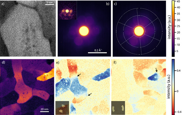 a) Cryo-STEM image displaying part of an enamel crystallite (see Pauls’ recently first co-authored Nature paper) b) Average diffraction pattern of the 4D STEM data set (high SNR). Inset: single diffraction pattern of the 4D STEM data set (low SNR). c) Average diffraction pattern with 12 segmented virtual detectors (indicated by white lines). d) Virtual image created from the average diffraction pattern, combining intensities from all segmented virtual detectors. e,f) Maps displaying the differences in intensity between two selected opposite partial virtual detectors (indicated in inset). This difference in intensity is indicated in the red to blue color bar on the right. The black arrows indicate places within single grains that show variations in intensity between the opposed virtual detectors, which signify a tilt in the crystallographic directions of the apatite lattice with respect to one other. A special thanks to Dr. Roberto dos Reis & Stephanie M. Ribet for helping with data analysis using Python scripting.