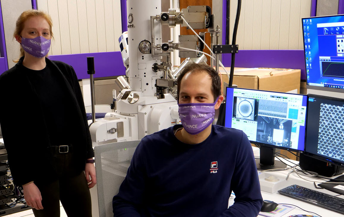 JEM-ARM300F room where he was working to image and analyze materials at the atomic level. He has been at NUANCE since 2019, after joining Northwestern University in 2016 as a Postdoctoral Research Fellow. His primary focus has been on characterization of soft-hard matter interfaces in materials, predominantly in teeth and other (bio)minerals. “There are lots of different materials that I work on as well as trying to do some of my own projects, such as characterization of human enamel crystallites using 4D STEM experiments, in order to elucidate structural details which can lead to tooth decay. I use the FIB-SEM to prepare the samples and visualize these in the ARM300F, which is rather intricate given the sensitivity of the material to high energy electrons. Now that we have capable direct electron detectors and the possibility to explore lower accelerating voltages down to 40kV on the ARM300, I am excited to explore this further,” Paul said.