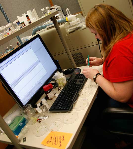 Ph.D. candidate Ashton Lesiak's work is focused on profiling what are known as “legal alternatives” to plants that are abused for their psychotropic effects. Ultimately she foresees a database and reference guide that will help forensic scientists quickly confirm the presence of such plants, she said. "When plants of abuse are found at a crime scene they are usually ground up or dried. The usual way to determine what the plants are is to look for characteristic morphological features by microscopy. When the plant is dried or ground, it loses its characteristic morphological features and microscopy becomes less useful in identifying the plant. However, if you analyze the material directly using DART MS, its chemical profile will be revealed and this can be used to identify the plant. For example you easily can detect THC in marijuana, atropine and scopolamine in Datura seeds, and mitragynine in Kratom. Detecting these small molecule biomarkers helps in identifying unknown plant material.”