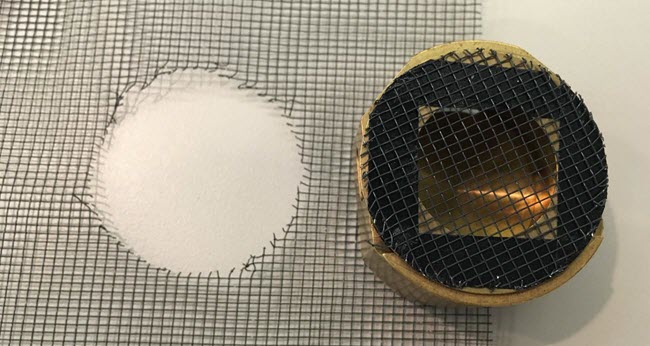 For illustration purposes a piece of window screen was used to demonstrate this technique, as spider silk would be too small to show up in the macro photos. A strip of conductive C tape was applied to completely surround the removable cap of a holder designed to hold polished metallographic mounts. This was then pressed onto the web and lifted off. This allowed the intact web inside the tape to be ripped away from the rest of the web outside of the tape without any stress or strain. The cap was then placed onto the specimen holder for insertion into the SEM. This type of mounting allows the microscopist to have nothing in the background of the image.
