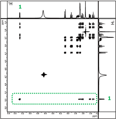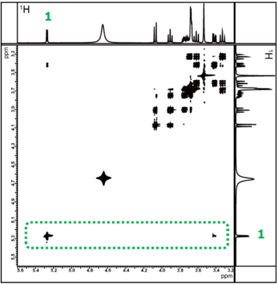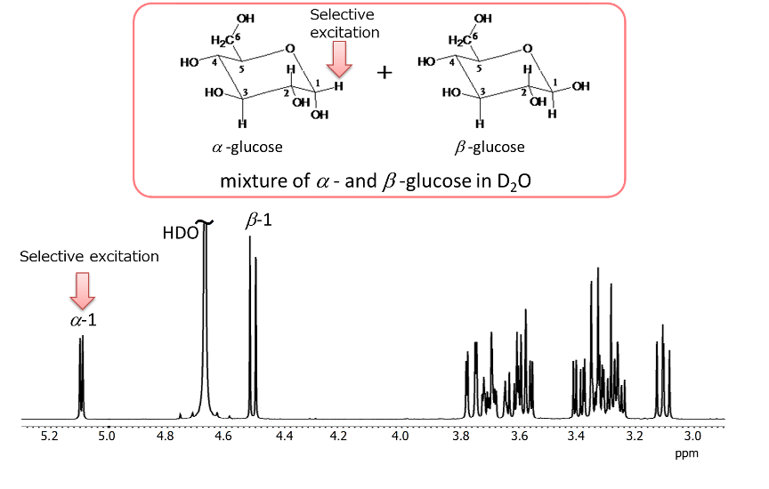 Glucose exists in aqueous solution as α- and β-anomers. Therefore, the 1H NMR spectrum is a mixed spectrum of α-glucose and β-glucose, as shown in Figure 13. For selective excitation of a 1H signal, it is typically to choose 1H appearing at a lower field than others (in the case of sugars, 1H at the anomeric position). The result of a 1D TOCSY experiment by selectively exciting the anomeric 1H at position 1 of α-glucose is shown in Figure 14.