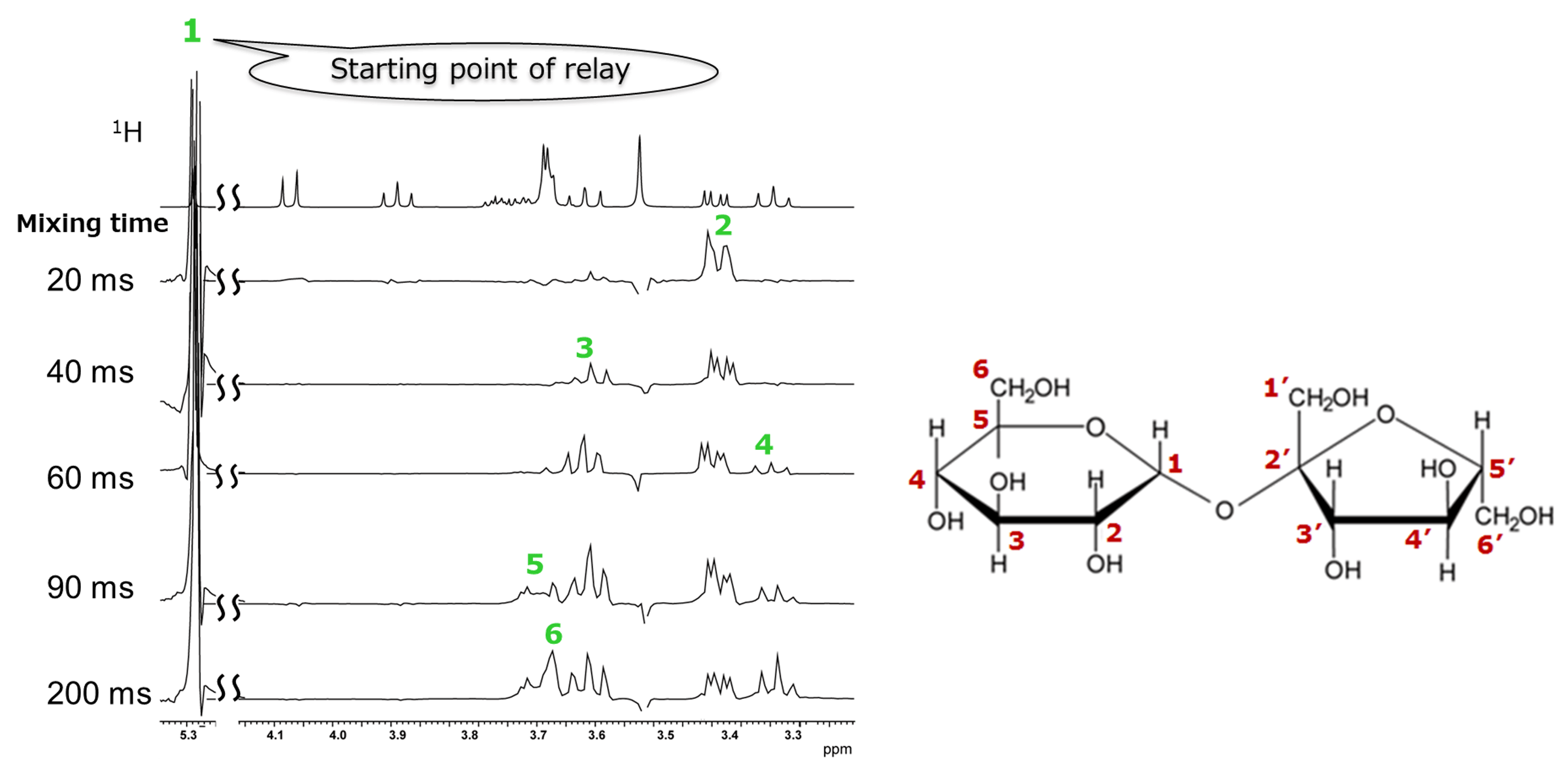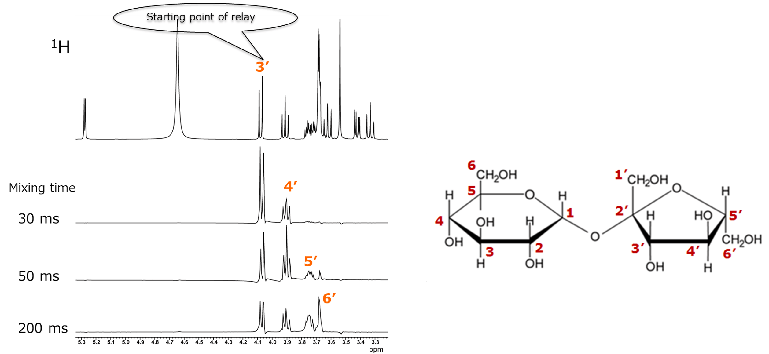 The top spectrum in Figure 12 shows a conventional 1H spectrum, and below it are sliced data obtained with different mixing times. As before, we take the Fru H-3′ as the starting point of the relay. As the mixing time increases, correlations with the Fru H-4′, Fru H-5′, and Fru H-6′ appear, allowing us to confirm the connections within the fructose moiety.