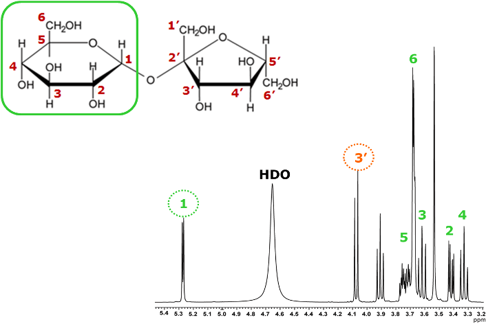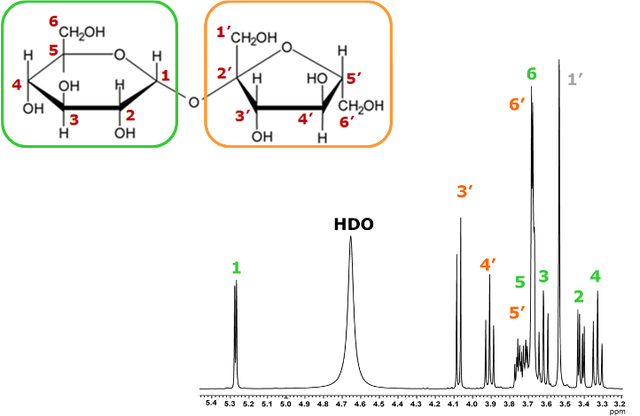 Here, we present an example of analysis for sucrose using 2D TOCSY. Sucrose is a disaccharide composed of glucose and fructose linked by a glycosidic bond. Sucrose contains a total of 22 1Hs, but since the sample is dissolved in heavy water, the 1Hs of the hydroxyl groups (-OH) are not observed due to deuterium exchange. Therefore, in this case, 14 1Hs are observed, excluding the 8 1Hs of hydroxyl group.