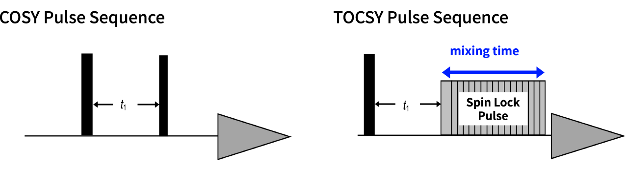Fig. 4 shows the pulse sequences for COSY and TOCSY. COSY uses two 90° pulses, while with the TOCSY, the second pulse is a spin lock pulse. The duration of this spin lock pulse is called "mixing time," which is a key parameter with TOCSY. By increasing the mixing time, you can observe correlation signals that have been relayed over longer distances within the spin system.