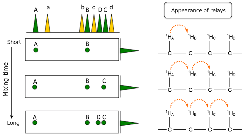 The longer the mixing time, the farther the magnetization can move. Therefore, if a sufficiently long mixing time is used, the magnetization can be transferred through all 1Hs within the same spin system, allowing the detection of correlation signals for all 1Hs in that spin system. Furthermore, by comparing spectra obtained with different mixing times, the sequential order of the 1H connections can also be known.