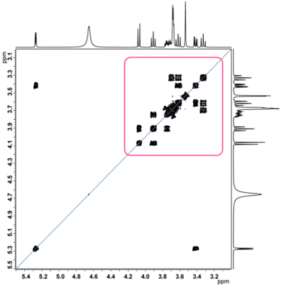 In Figure 7, six correlation signals can be found relatively easily. However, it is difficult to interpret the correlations of signals appearing in areas where chemical shifts are close to each other, such as those indicated by the red circles in Figure 8. Many people may get stuck at this point in the analysis. Therefore, we will try using the TOCSY method.