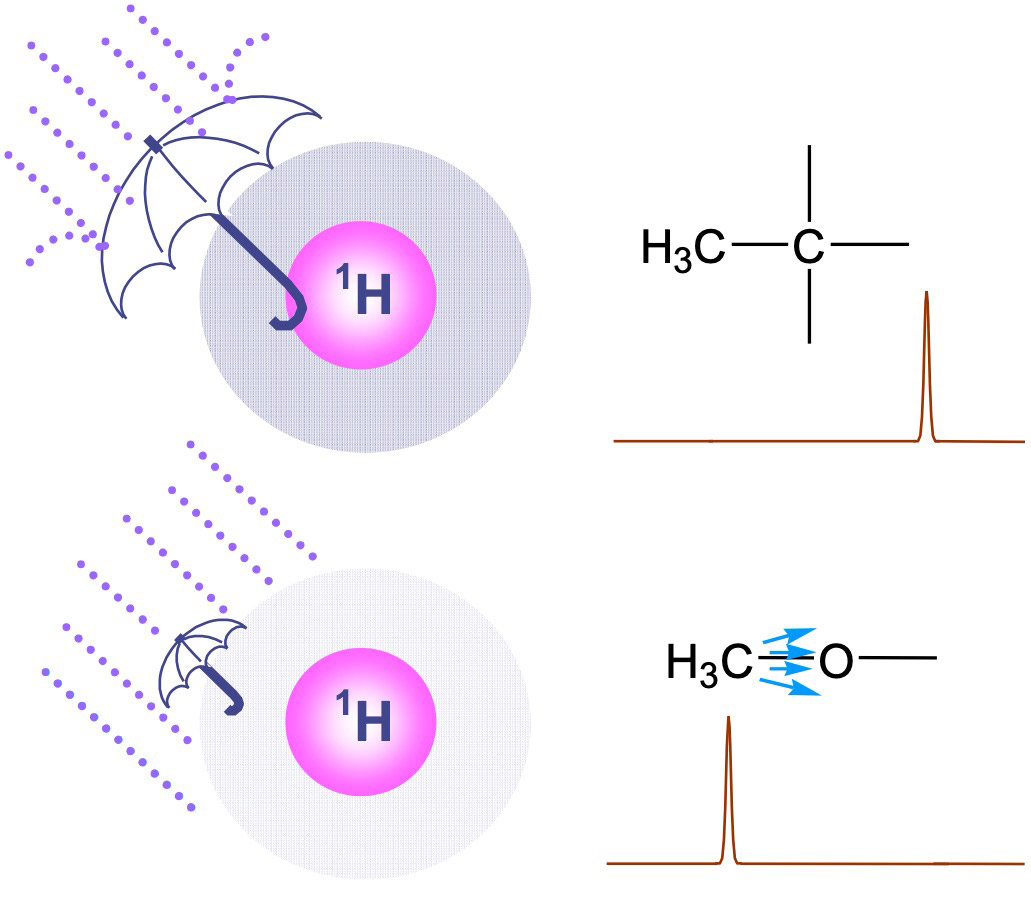 As shown in Fig 2, depending on the height of the electron density existing near the nuclear spin, the strength of shielding of the magnetic field (the strength of the magnetic field that the nuclear spin receives) varies.