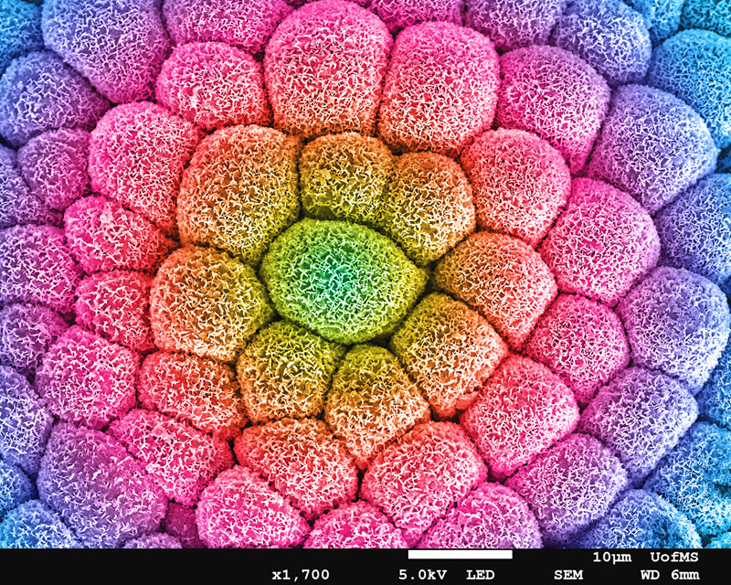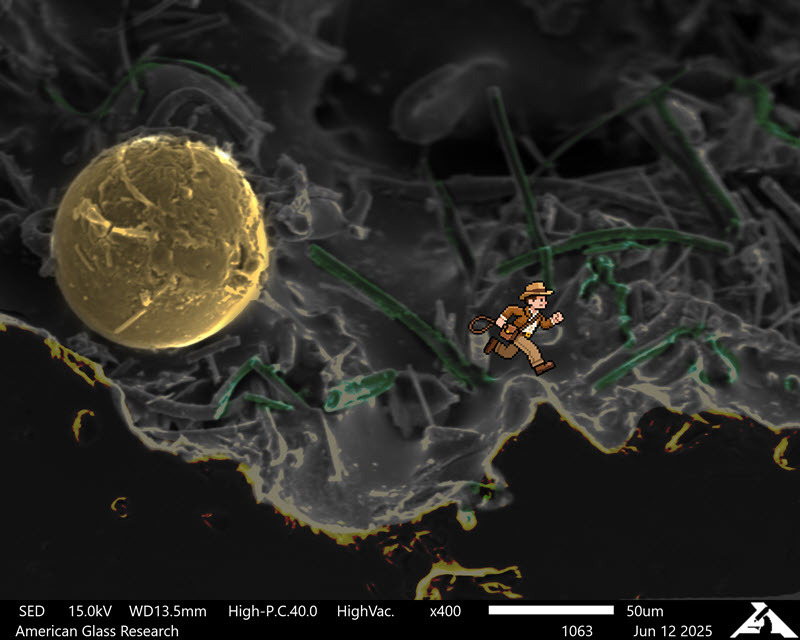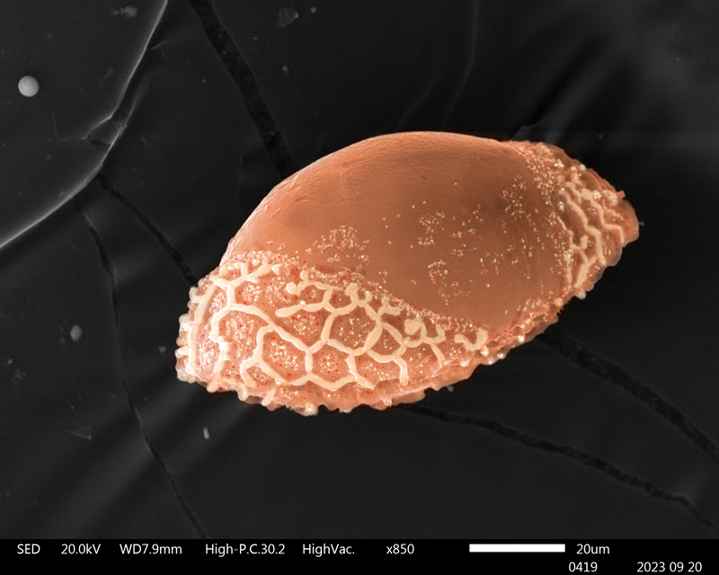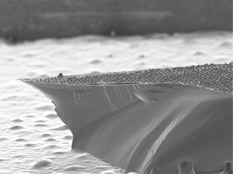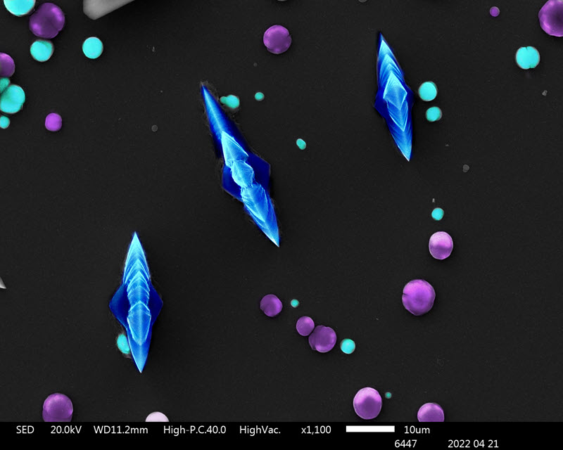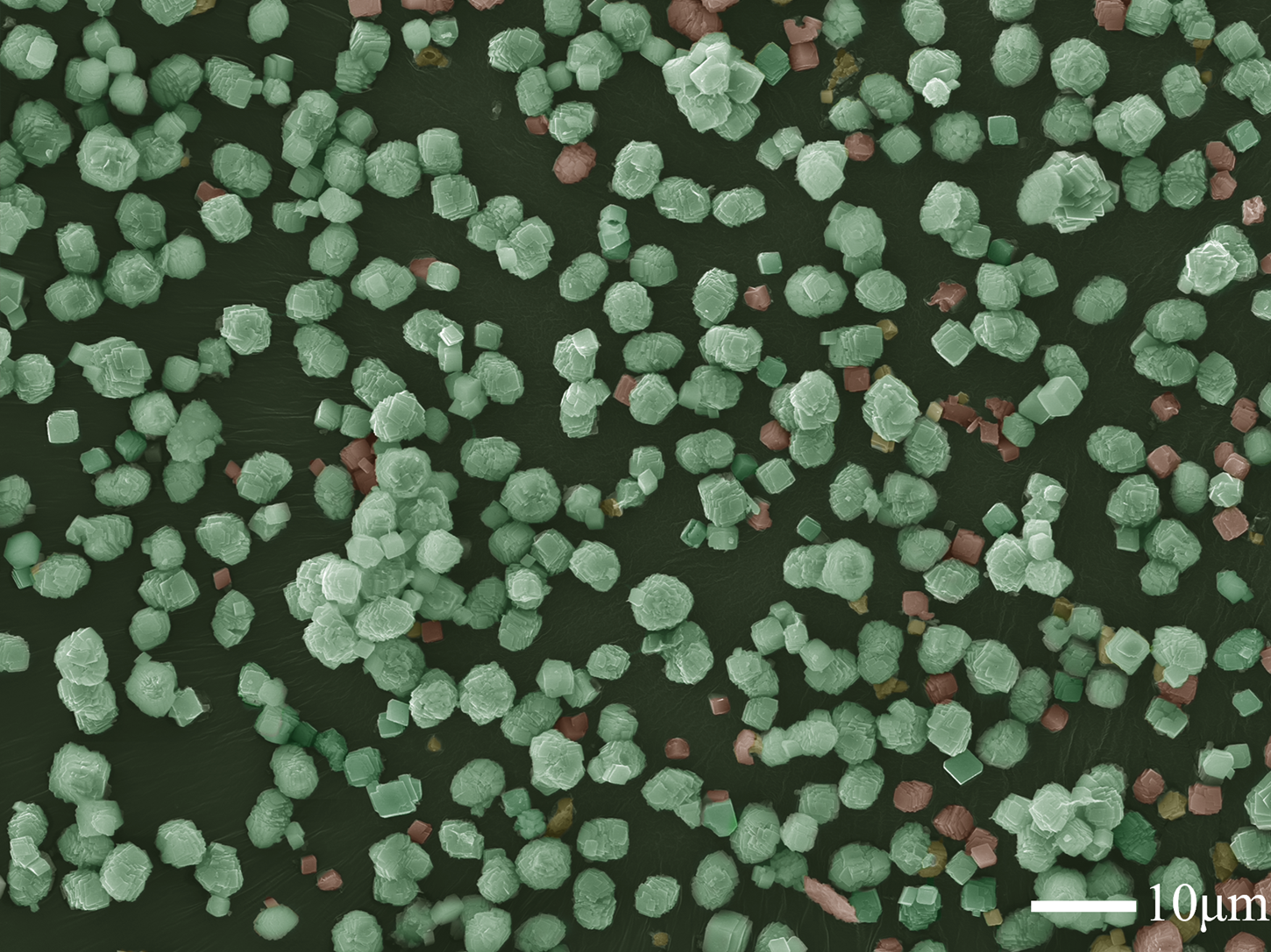SUBJECT: The image shows tin dioxide nanoparticles atop a silicon wafer. Upon exposure to a small droplet of ethanol, the nanoparticles have coalesced into 'house-like' structures. The fractured silicon wafer resembles a rugged cliff side, while the carbon tape supporting the sample displays subtle ripples, reminiscent of an ocean's surface. Together, these elements combine to create a captivating scene that mirrors a small town perched on a cliff above the sea.; CREDIT: Luke Taglini, Macquarie University; METHOD/INSTRUMENT: JEOL JSM 7100-F