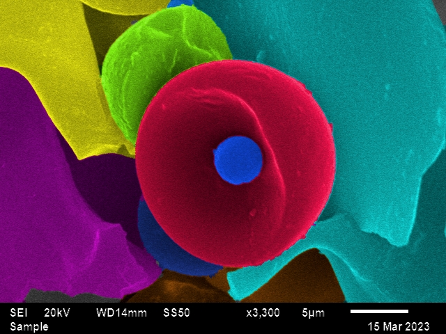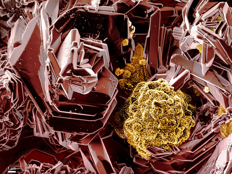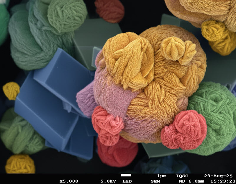 SUBJECT: Different geometric shapes of calcium carbonate, chemical reaction with clay; CREDIT: Márcio de Paula, Institute of Chemistry of São Carlos - University of São Paulo (IQSC-USP); METHOD/INSTRUMENT: JSM 7200F