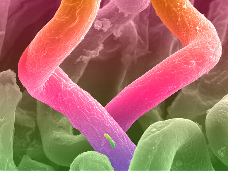 SUBJECT: Microbes on the trichome-covered surface of a plant leaf, visualized using scanning electron microscopy (SEM). Pseudocolored for artistic look.; CREDIT: John Adams Sebastian, University of Mississippi; METHOD/INSTRUMENT: JEOL JSM-7200FLV FE-SEM