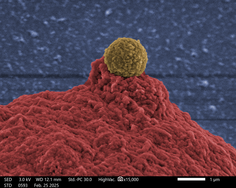 SUBJECT: A vesicle (in yellow) buds from the surface of a keratinocyte (in red) cultured on a polymer scaffold (in blue) 96 hours post-seeding. Captured at 15,000x magnification using SEM, this image shows the textured surface of a stressed, rounded cell and a budding vesicle that may represent an apoptotic body.; CREDIT: Peyton Leyendecker, University of Pittsburgh; METHOD/INSTRUMENT: JSM-IT710HR