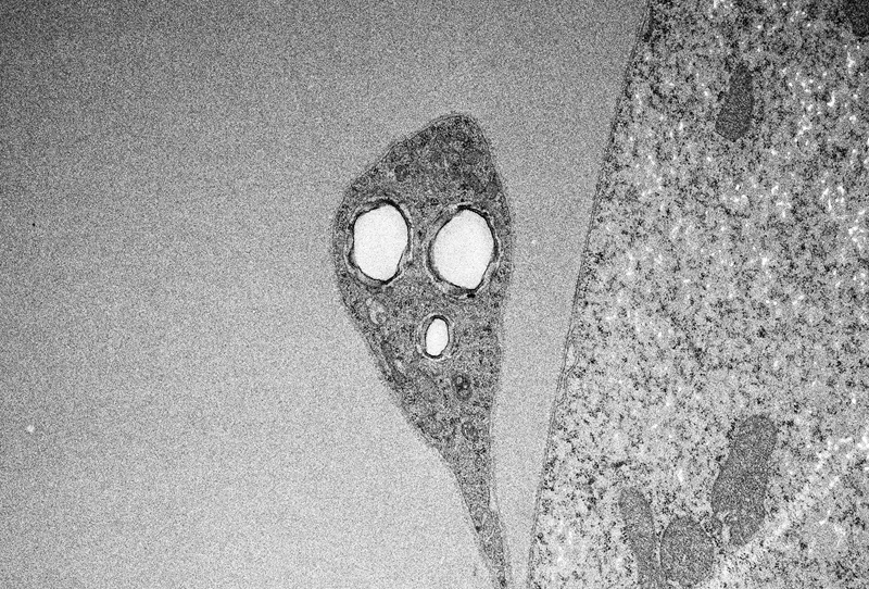 The Grand Prize Transmission Electron Microscope (TEM) Image award was given to Lita Duraine, a certified electron microscopist at Baylor College of Medicine in Baylor, Texas. “The Screamer 2020” resembles a screaming cartoon character (possibly a good depiction of how many felt about 2020), but is actually a detailed, high magnification image showing firing between boutons in a Drosophila melanogaster (fruit fly) sample. It was imaged on the JEOL JEM-1400Plus TEM as part of a bouton study on muscle weakness. Lita explains that “Manipulating Drosophila melanogaster is a bit challenging from an electron microscopy point of view, but is so indispensable for genomic research in Amyotrophic lateral sclerosis (ALS), Alzheimer’s, and other debilitating diseases.” The common fruit fly serves as a model organism for studying genetics and other fields of research.