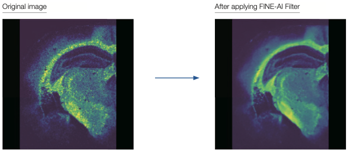 Our newest MS imaging data processing software msMicroImagerTM version 3 (optional) is now equipped with FINE-AI Filter, a noise filtering technology that uses AI (machine learning). This new FINE-AI Filter originates from the JEOL LIVE-AI (Live Image Visual Enhancer-AI) technology developed for our scanning electron microscopes (SEM), which was re-optimized for MS imaging and implemented to achieve significant improvements to the quality of MS images.