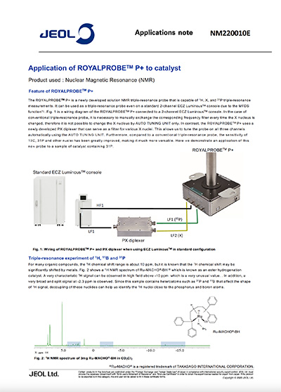 The ROYALPROBE™ P+ is a newly developed solution NMR triple-resonance probe that is capable of 1H, X, and 31P triple-resonance measurements. It can be used as a triple-resonance probe even on a standard 2-channel ECZ Luminous console due to the MFDS function.