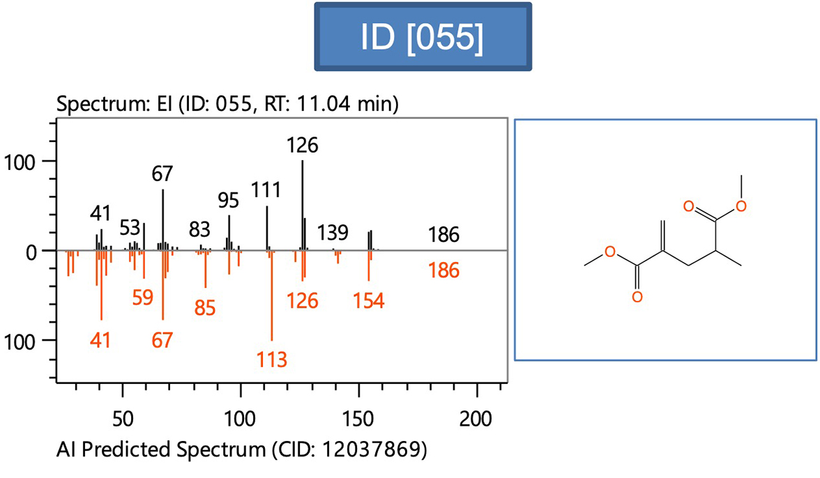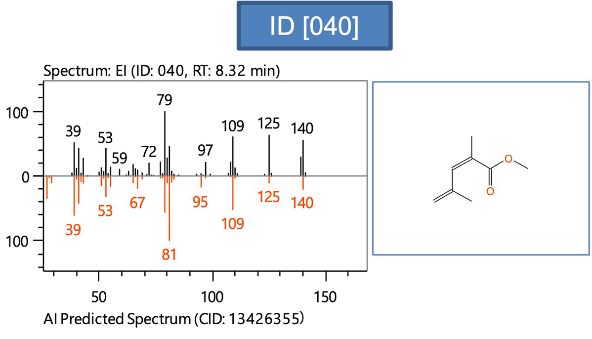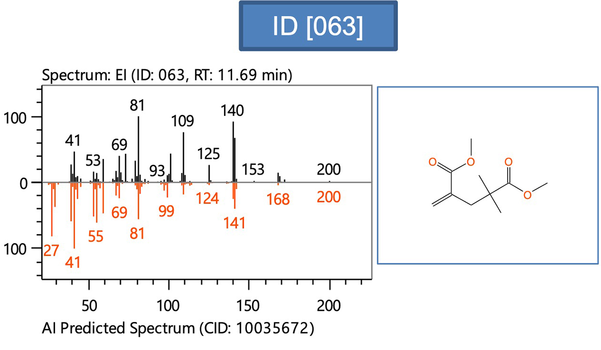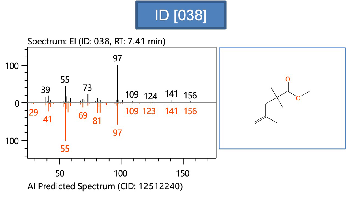Among the observed acrylic resin pyrolysis products, AI structural analysis was performed for four components not registered in the NIST library database and for which structural formulas were proposed in reference [1]. Figure 2 shows the TIC chromatograms obtained from the Py-GC-EI and FI measurements. The peaks with IDs [038], [040], [055], and [063] in Figure 2 are the four components analyzed in this study. Figure 3 shows the measured EI mass spectra for these four components (upper, black), the structural formula proposed in the reference literature (right side of the spectrum), and its predicted EI mass spectrum (lower, red).