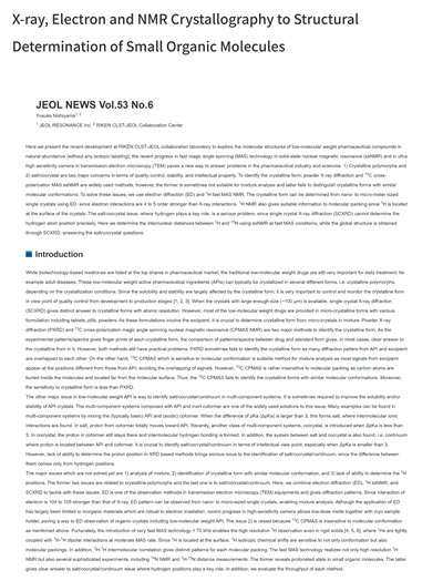 While biotechnology-based medicines are listed at the top shares in pharmaceutical market, the traditional low-molecular weight drugs are still very important for daily treatment, for example adult diseases. These low-molecular weight active pharmaceutical ingredients (APIs) can typically be crystallized in several different forms, i.e. crystalline polymorphs, depending on the crystallization conditions. Since the solubility and stability are largely affected by the crystalline form, it is very important to control and monitor the crystalline form in view point of quality control from development to production stages [1, 2, 3]. When the crystals with large enough size (~100 μm) is available, single crystal X-ray diffraction (SCXRD) gives distinct answer to crystalline forms with atomic resolution. However, most of the low-molecular weight drugs are provided in micro-crystalline forms with various formulation including tablets, pills, powders. As these formulations involve the excipient, it is crucial to determine crystalline form from micro-crystals in mixture. Powder X-ray diffraction (PXRD) and 13C cross-polarization magic angle spinning nuclear magnetic resonance (CPMAS NMR) are two major methods to identify the crystalline form. As the experimental patterns/spectra gives finger prints of each crystalline form, the comparison of patterns/spectra between drug and standard form gives, in most cases, clear answer to the crystalline from in it. However, both methods still have practical problems. PXRD sometimes fails to identify the crystalline form as many diffraction patters from API and excipient are overlapped to each other. On the other hand, 13C CPMAS which is sensitive to molecular conformation is suitable method for mixture analysis as most signals from excipient appear at the positions different from those from API, avoiding the overlapping of signals. However, 13C CPMAS is rather insensitive to molecular packing as carbon atoms are buried inside the molecules and located far from the molecular surface. Thus, the 13C CPMAS fails to identify the crystalline forms with similar molecular conformations. Moreover, the sensitivity to crystalline form is less than PXRD.